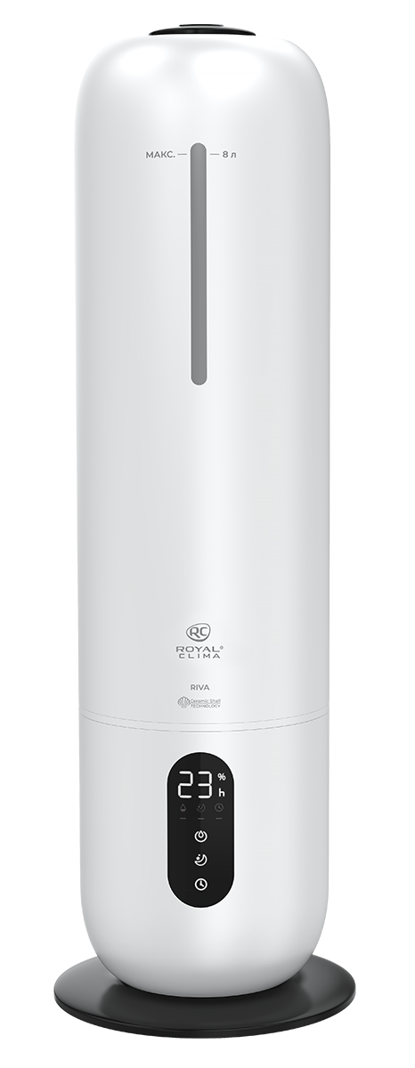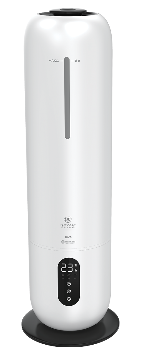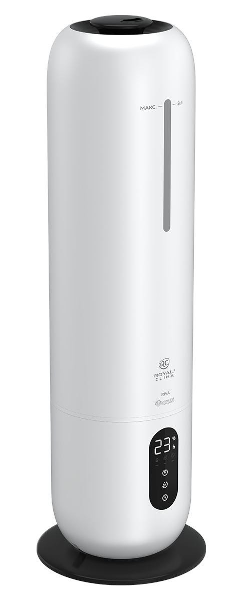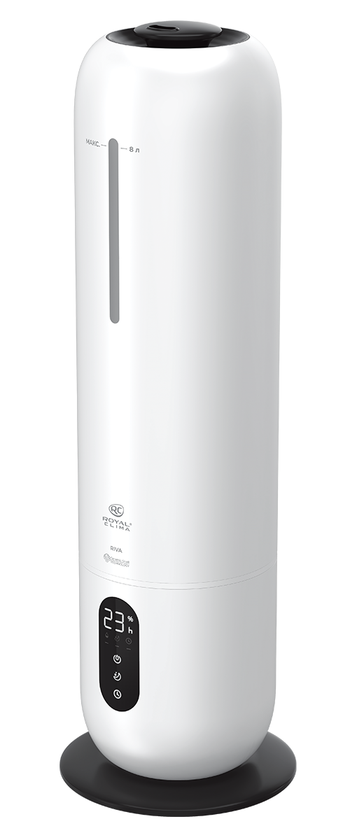 Увлажнитель воздуха RIVA (РИ́ва) от ROYAL CLIMA обладает революционным увеличенным объемом резервуара для воды: 8 литров. Работа без долива воды от 26 часов. Максимальная интенсивность увлажнения воздуха 300 мл/ч.