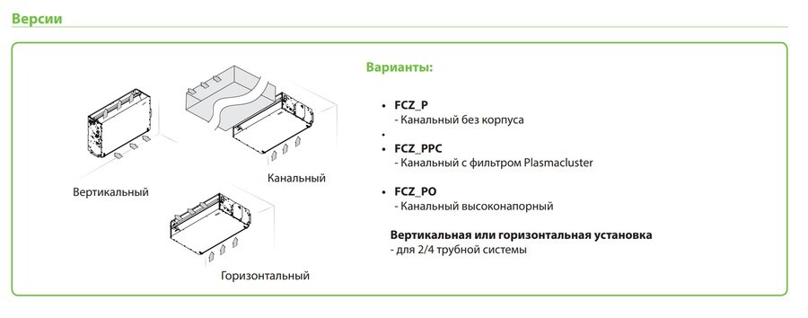 • FCX PPC — вертикальная или горизонтальная установка на стене или потолке, с фильтром Plasmacluster, совместим с системой управления VMF, а также может управляться с помощью панели управления PXAE.