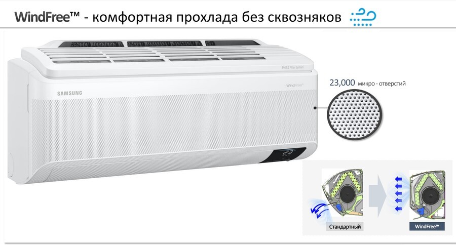 Серия Wind Free Mass Geo настенных сплит-систем от Samsung представляет собой мощное и эффективное климатическое оборудование, разработанное специально для домашнего использования. Эти модели обладают простой установкой и эксплуатацией, не требуют сложного технического обслуживания и обладают широким функционалом, который позволяет быстро создать комфортный микроклимат в помещении в любое время года.