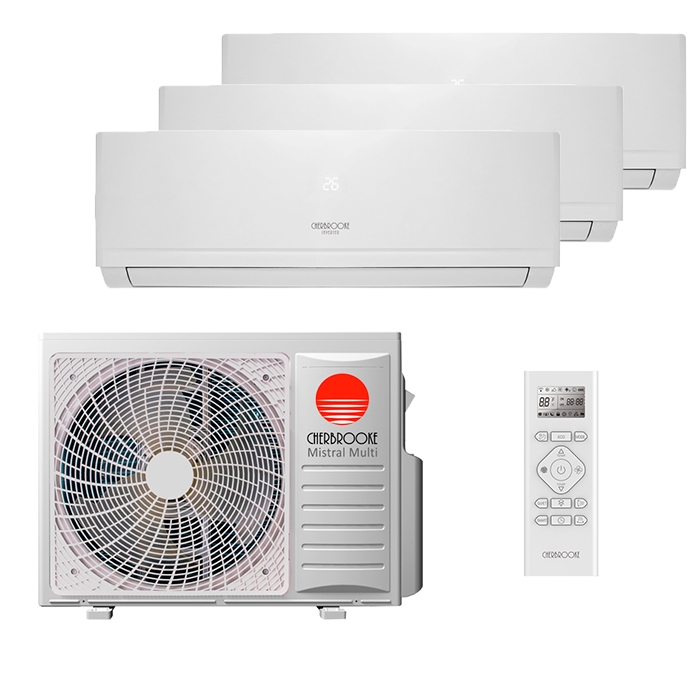 Для поддержания комфортной температуры в доме не обязательно устанавливать два отдельных кондиционера, вместо этого, можно установить мульти сплит систему с одни наружным блоком и несколькими внутренними. Каждый из блоков будет работать самостоятельно, исходя из пожеланий пользователя в пределах выбранного режима (либо на обогрев, либо на охлаждение). Комплект Cherbrooke AMI-09UW4RK x 3 / AOI4-27U4RK подойдет для 3 комнат, площадь каждой до 25 кв.м.