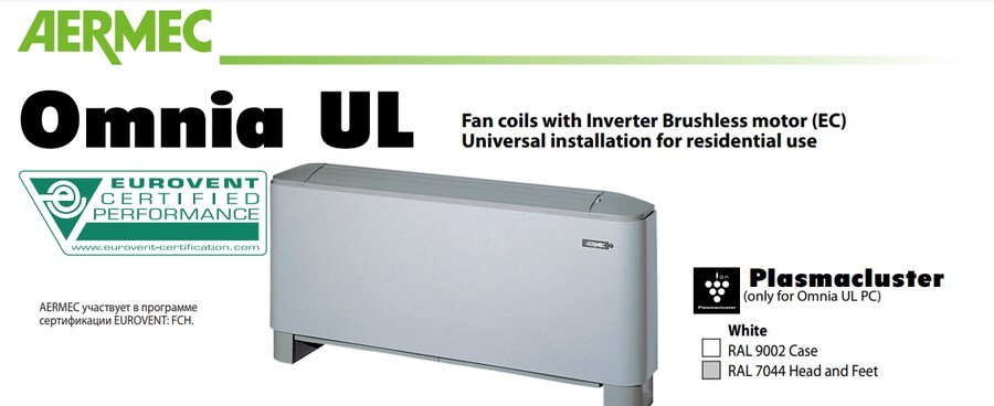Серия Omnia UL — это еще один модельный ряд фанкойлов, разработанных итальянской торговой маркой Aermec. Серия включает модели напольно-потолочного, а также канального типа. Первые имеют универсальное и вертикальное исполнение, укомплектованы воздушной заслонкой или жалюзи для воздухораспределения. Вторые не оснащены корпусом и предназначены для скрытой установки за подвесным потолком.