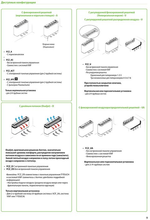 Линейка FCZ — это современные фанкойлы универсальной установки, разработанные компанией Aermec. Серия весьма разнообразна и включает модификации для монтажа в вертикальном или горизонтальном положении, оснащенные панелями управления, а также без них. Семейство также имеет модели с исполнением Dualjet — с двойным воздушным потоком.
