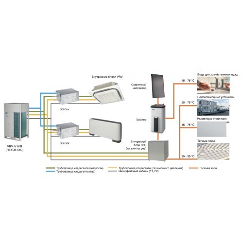 - Различные комбинации внутренних блоков, вентиляционных установок HRV, низко- и высокотемпературных гидроблоков, подключение к системам вентиляции