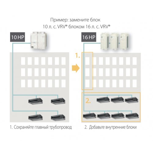 Наружные блоки серии RXYQQ используются для организации мультизональной сплит-системы с применением эффективного хладагента R410A. Примененная инверторная технология гарантирует стабильность действия и высокую производительность оборудования. Устройства линейки характеризуются большой протяженностью трасс трубопроводов, малым расходом электроэнергии и простотой монтажных работ. Также с помощью климатических установок можно модернизировать существующие VRV системы.