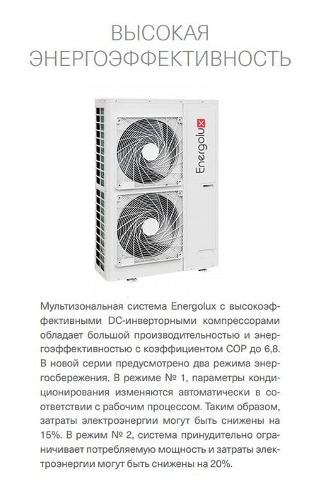 Модель наружного блока Energolux (Энерголюкс) SMZ3U60V2AI (3 фазы) отличается долговечностью, ведь облачена в прочный коррозиеустойчивый корпус и оснащена современным двигателем инверторного типа. Оборудование не создает сильного шума при работе, поэтому не беспокоит соседей. Устройство также укомплектовано надежным осевым вентилятором.