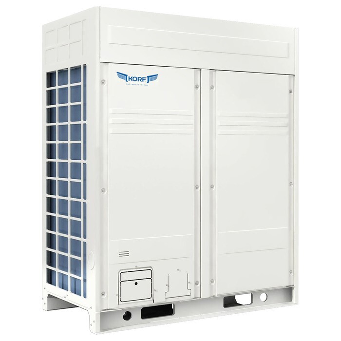 Наружный блок KORF (КОРФ) KF-OH-450B - 3 состоит из двух модулей, что обеспечивает резервирование системы. Кроме того, что имеется спаренная схема работы компрессоров, она позволяет в случае сбоя одного из них работать на оставшемся, что повышает надежность системы. Такая же особенность есть и у вентиляторов, при выходе из строя одного, блок продолжит работать с другим.