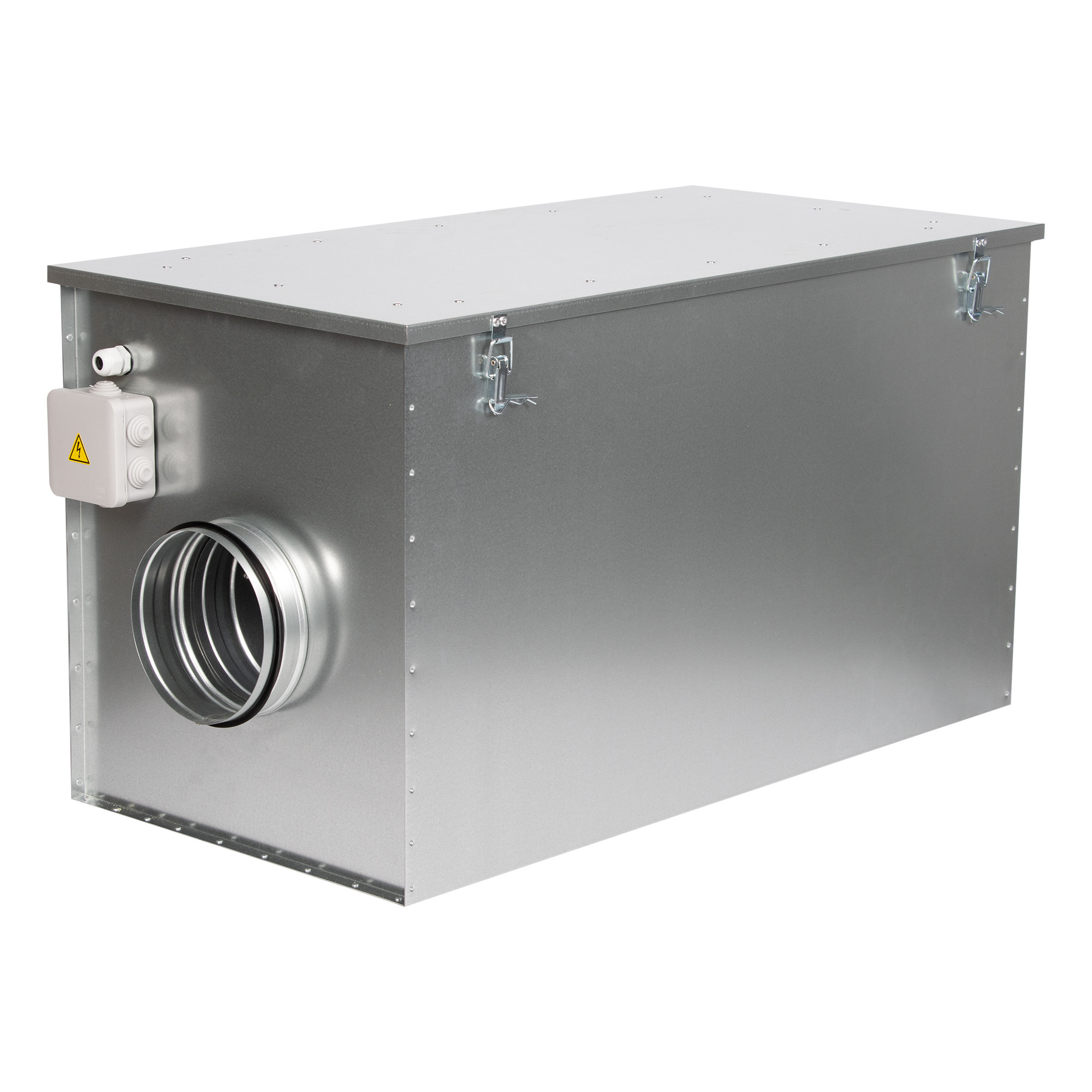 Приточная установка оснащена фильтром класса EU5, электрическим нагревателем с ТЭНами из нержавеющей стали и вентилятором. Вентилятор оборудован асинхронным двигателем с внешним ротором и не требующими обслуживания уплотненными подшипниками с увеличенным сроком службы. Защита двигателя вентилятора осуществляется встроенными термоконтактами. Трехфазные электрические нагреватели оснащены двухступенчатой защитой от перегрева. Первая ступень настроена на 50°С и перезапускается автоматически, вторая ступень настроена на 100°С и перезапускается вручную.