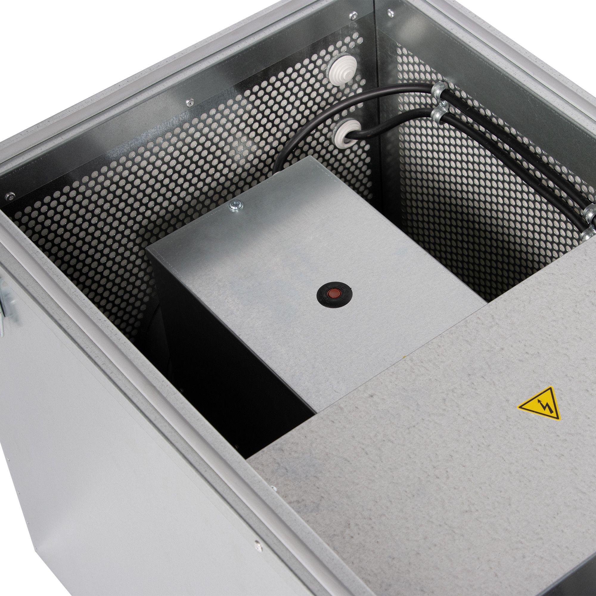 Приточная установка оснащена фильтром класса EU5, электрическим нагревателем с ТЭНами из нержавеющей стали и вентилятором. Вентилятор оборудован асинхронным двигателем с внешним ротором и не требующими обслуживания уплотненными подшипниками с увеличенным сроком службы. Защита двигателя вентилятора осуществляется встроенными термоконтактами. Трехфазные электрические нагреватели оснащены двухступенчатой защитой от перегрева. Первая ступень настроена на 50°С и перезапускается автоматически, вторая ступень настроена на 100°С и перезапускается вручную.