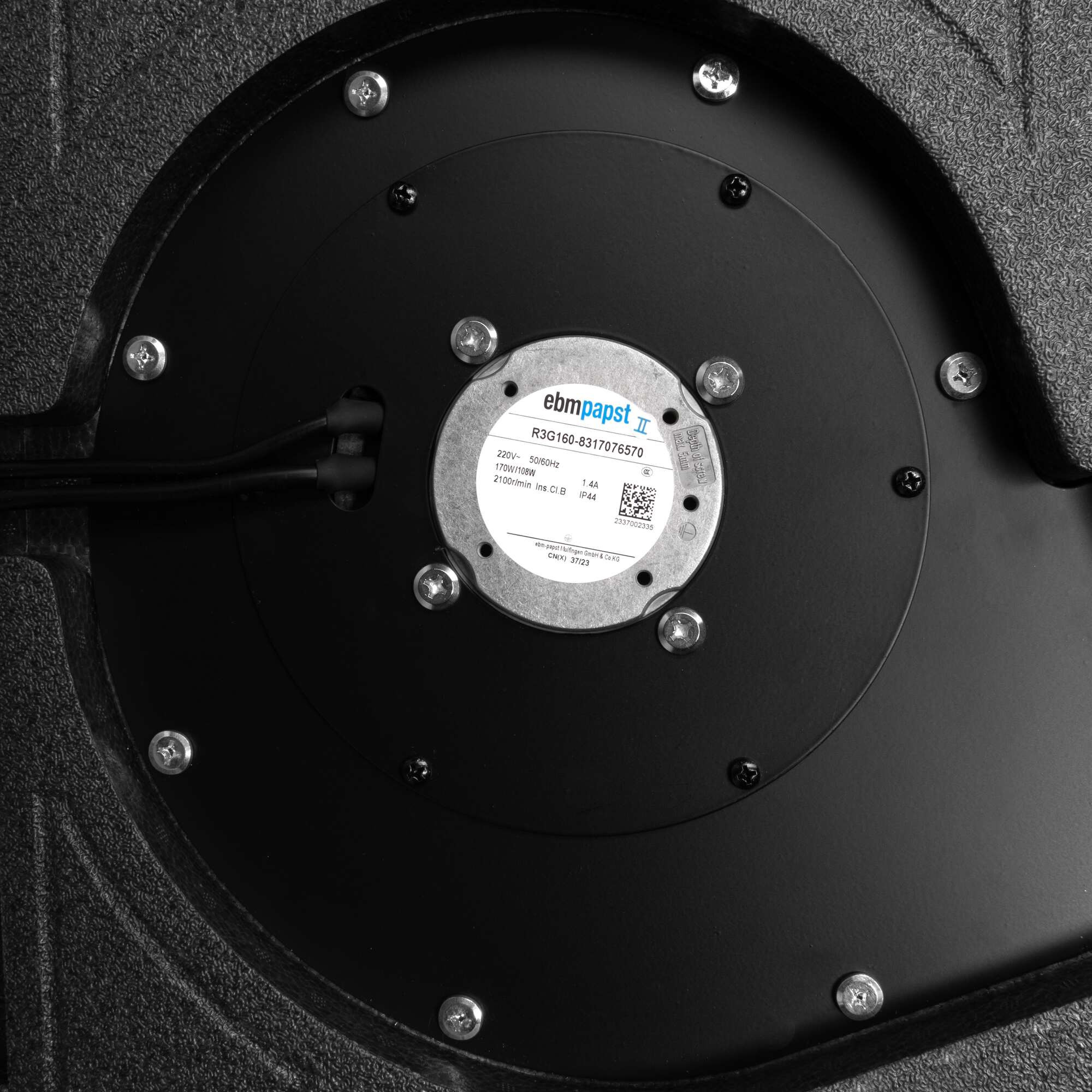 Вентиляторы Ebmpapdt (Германия) установок оборудованы высокоэффективными крыльчатками с вперед загнутыми лопатками и двигателями постоянного тока. Уплотненные шариковые подшипники двигателей не требуют техобслуживания и обеспечивают увеличенный срок службы. Защита двигателей вентиляторов осуществляется встроенными термоконтактами с автоматическим перезапуском при температуре 125°С.